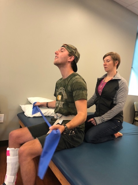Donderdagochtend gaan we weer fris en fruitig aan de slag. Met als verrassing bij de eerste therapie meteen lopen in het harnas. Dit keer zonder gipsvoet. Dat maakt het wat beter te doen voor Jesse. Het voelt stukken beter voor hem en hij doet het ook zonder gezeur. Met hulp van twee mannen aan zijn zijde, voelt hij zich zekerder en het gaat hem redelijk goed af. Een goed begin van de dag. Daarna oefent Jesse op de computer bij logopedie. Hij moet een presentatie van zichzelf maken en deze voordragen aan de twee logopedisten. Het voorstel was om dit in de praatgroep te doen maar dat vond hij too much. Hij probeert de presentatie eerst op de computer te maken en over een paar weken mag hij het vertellen. Weer een mooie uitdaging. Net zoals werken op de computer, want dat is toch heel anders dan het sociaal media gebeuren op de Ipad. Na logopedie volgt exercise. Daar werkt Jesse hard aan zijn houding en buik -en bilspieren.